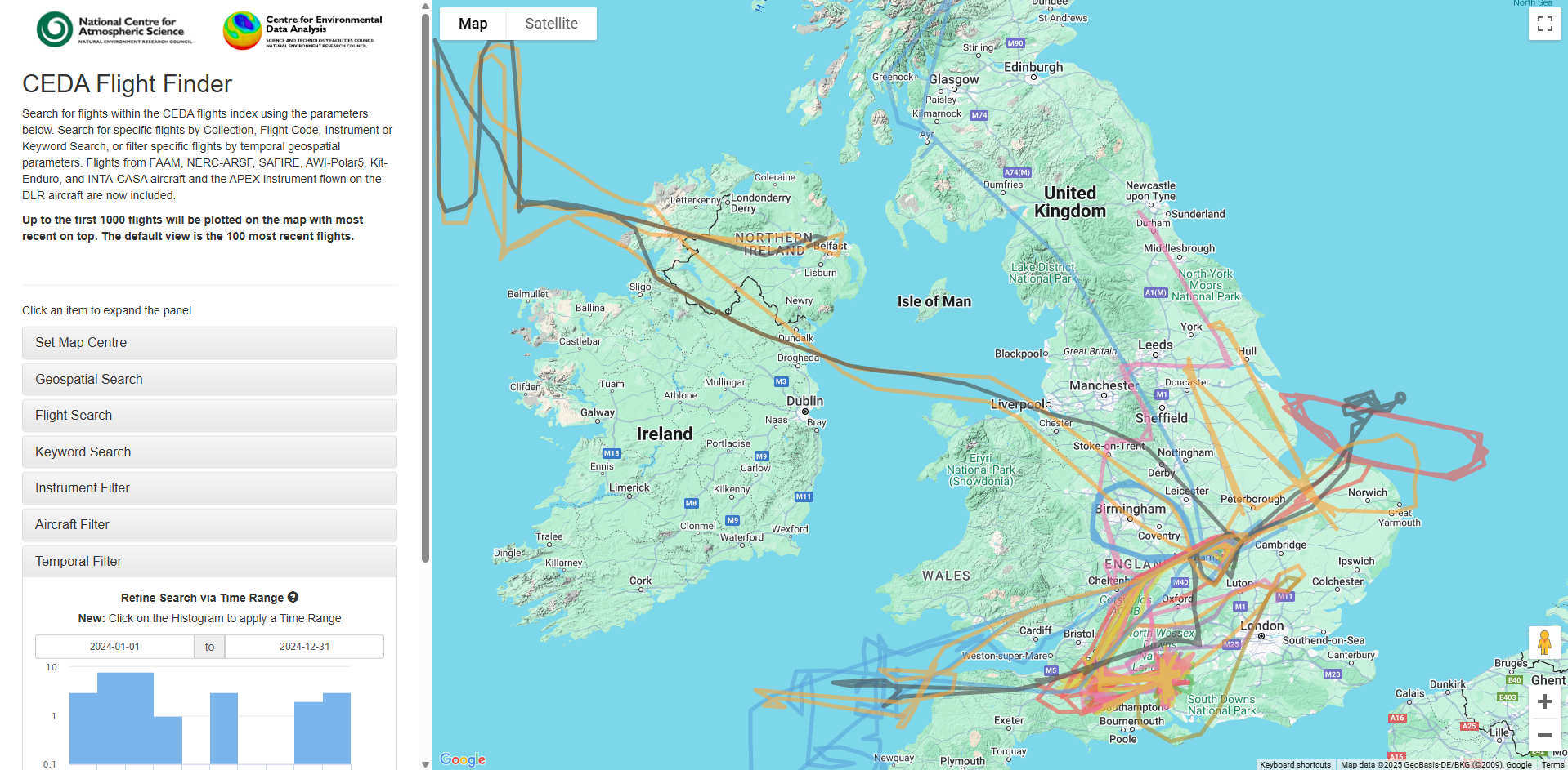 The CEDA Flight Finder tool allows searching for flights within the CEDA flights index using based on different paramenter parameters. Search for specific flights by Collection, Flight Code, Instrument or Keyword Search, or filter specific flights by temporal geospatial parameters. Flights from FAAM, NERC-ARSF, SAFIRE, AWI-Polar5, Kit-Enduro, and INTA-CASA aircraft and the APEX instrument flown on the DLR aircraft are now included. Up to the first 1000 flights will be plotted on the map with most recent on top. The default view is the 100 most recent flights.